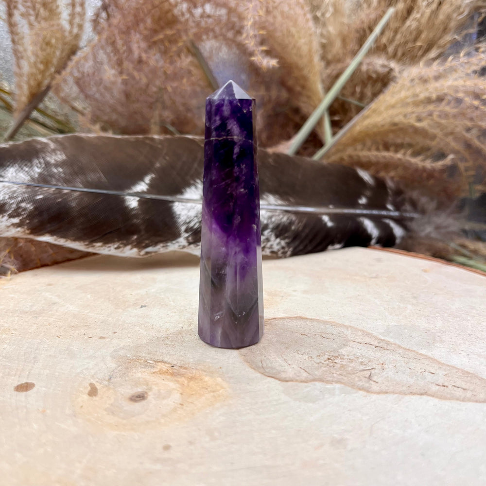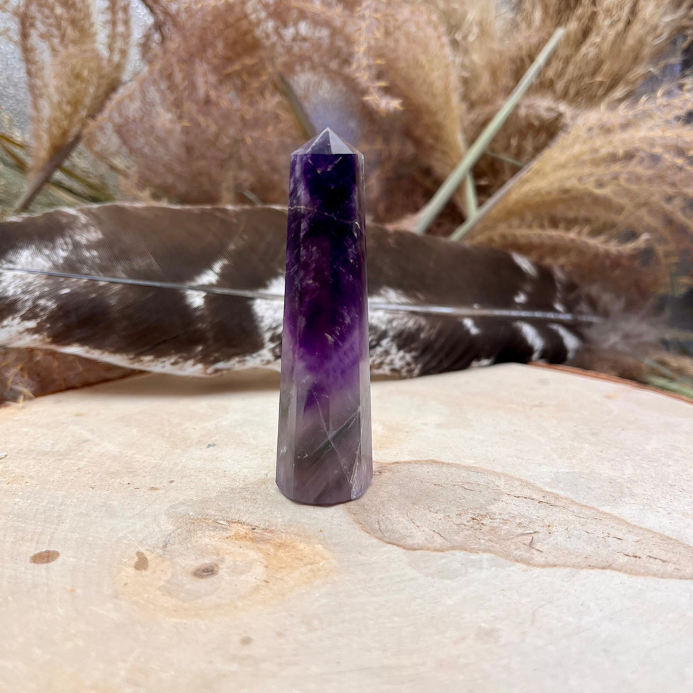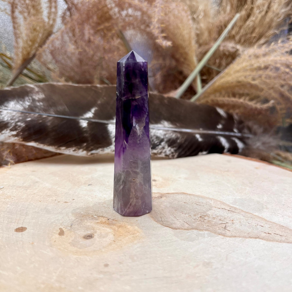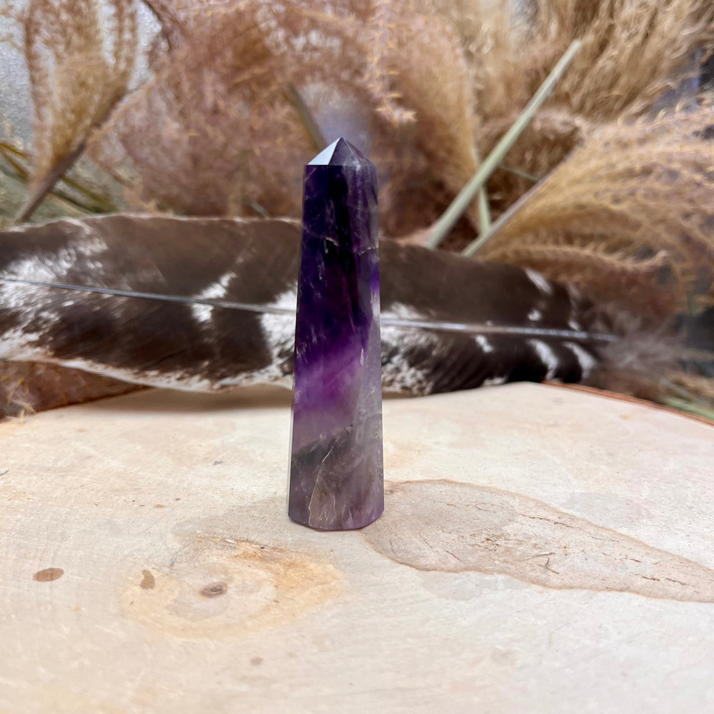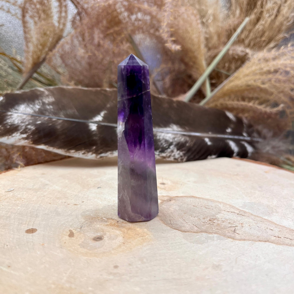 Ein Point, auch Obelisk oder Turm genannt, aus wunderschönem Amethyst. Je nach einfallendem Licht sind im Inneren des Edelsteins tolle Regenbogen-Lichtreflexe zu sehen.