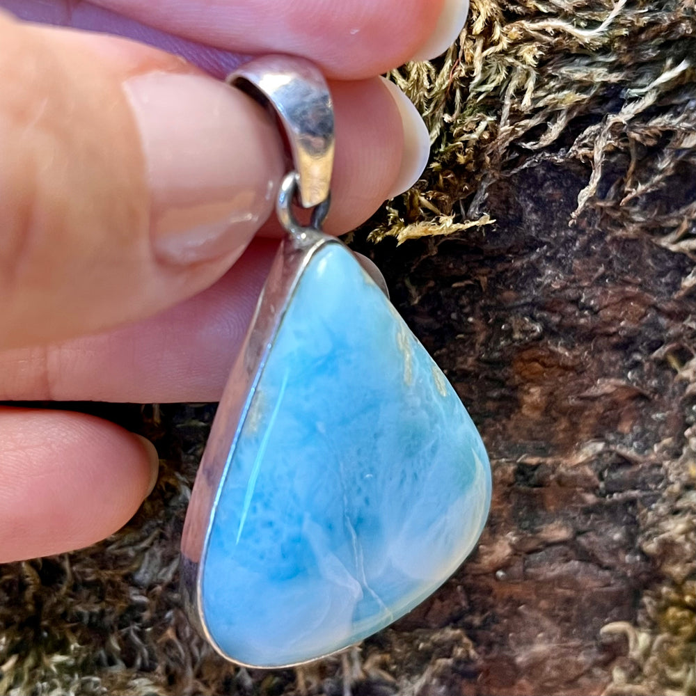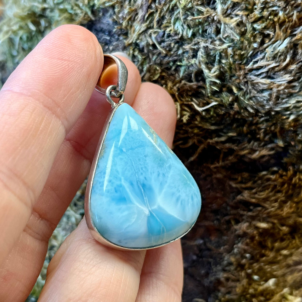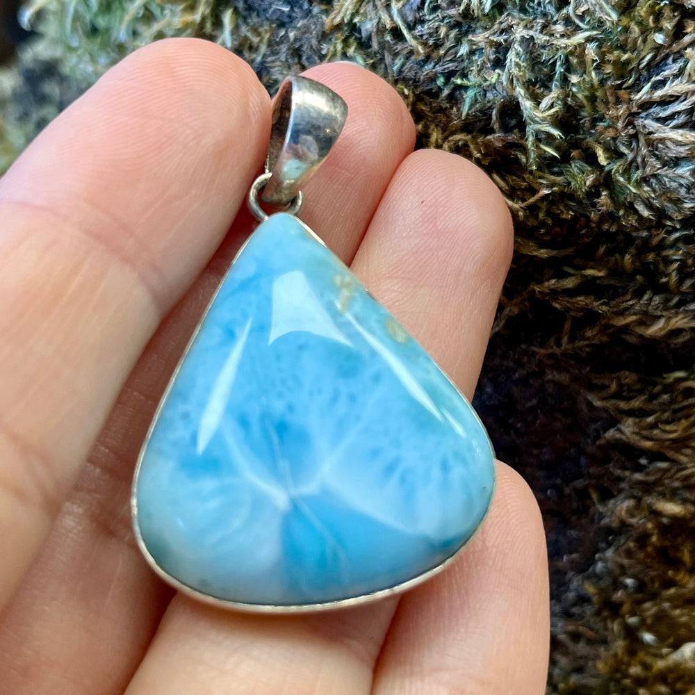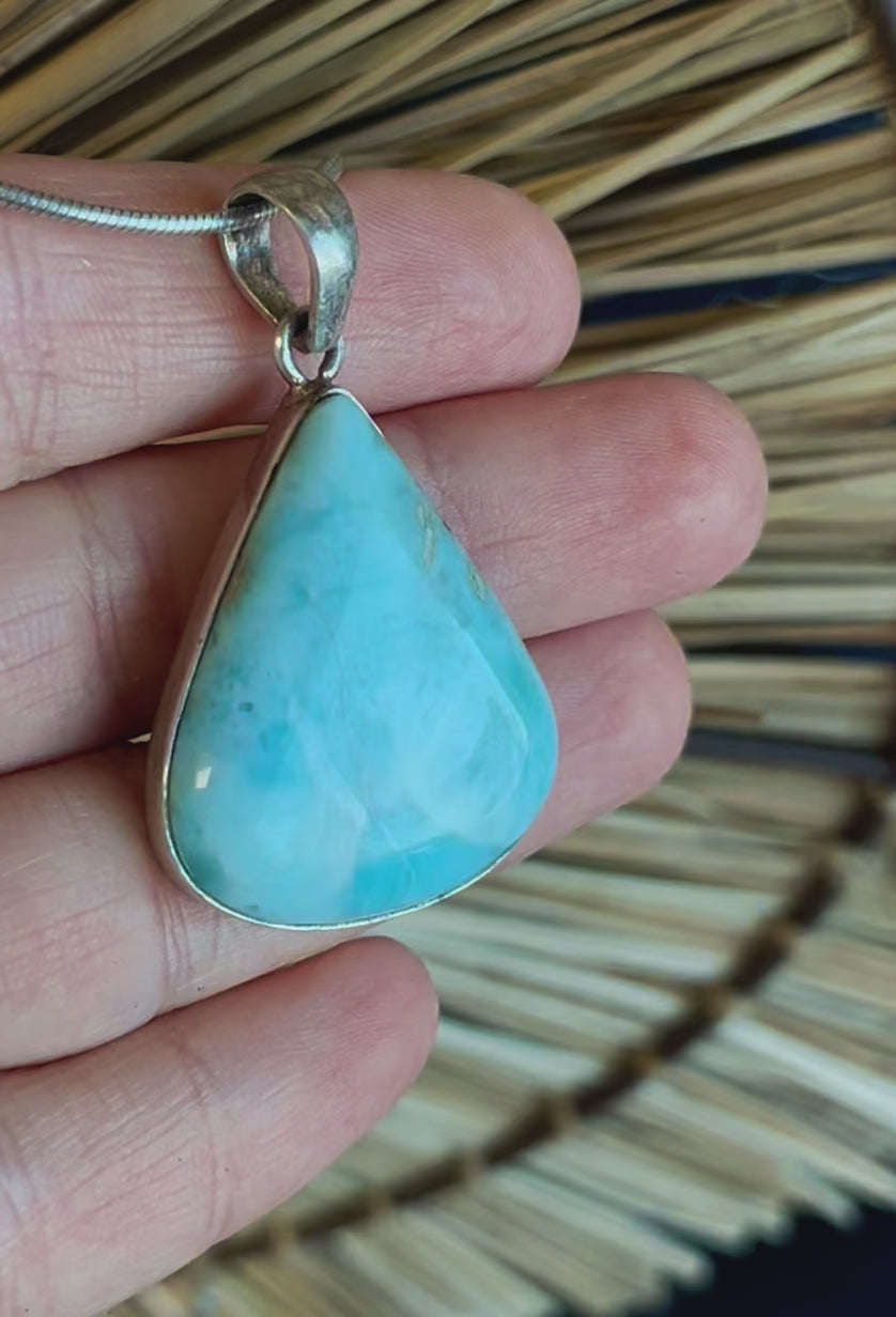 Ein einzigartiger Kettenanhänger aus Larimar, gefasst in 925er Silber. Er ist nicht nur ein absoluter Hingucker, er lässt sich auch sehr angenehm als Kette tragen.