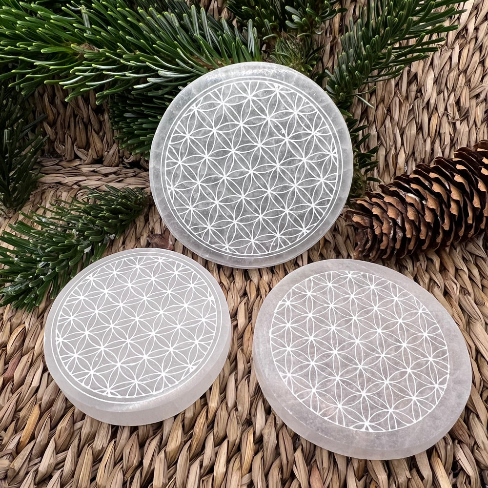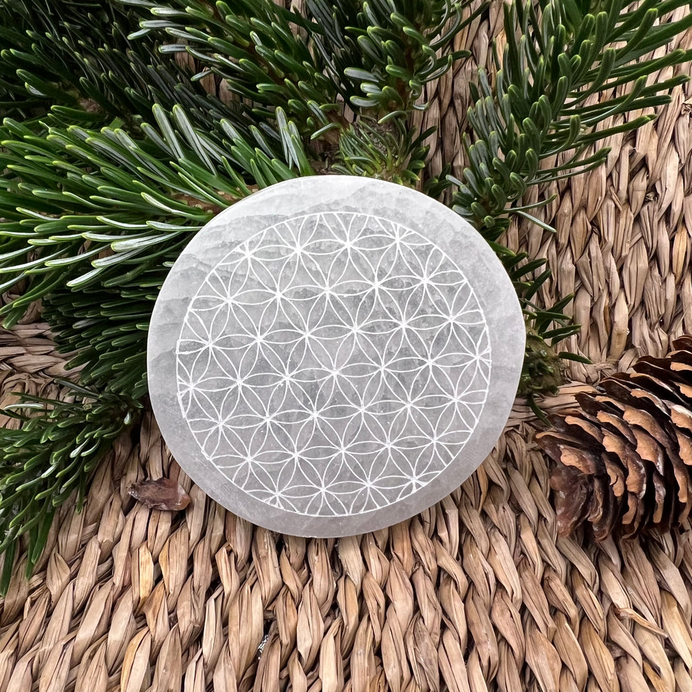 SKU: Selenit Aufladeplatte mit Blume des Lebens 10 cm