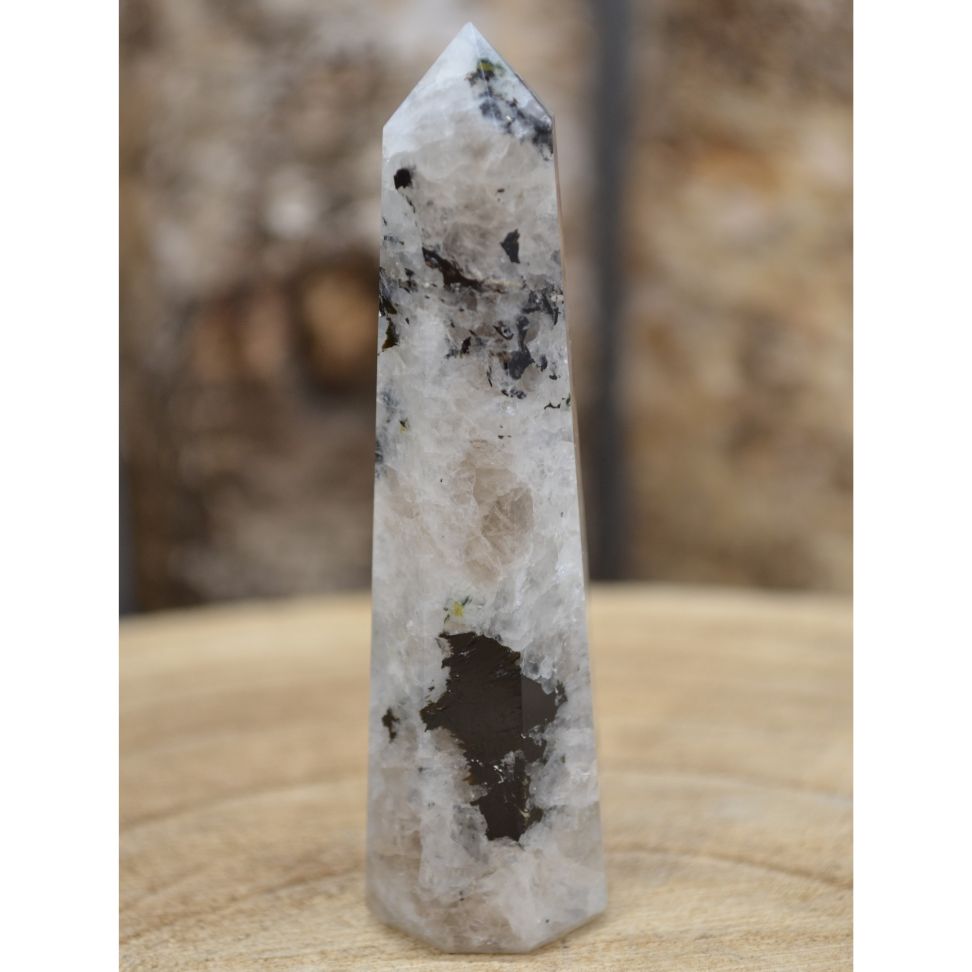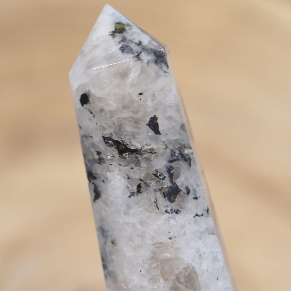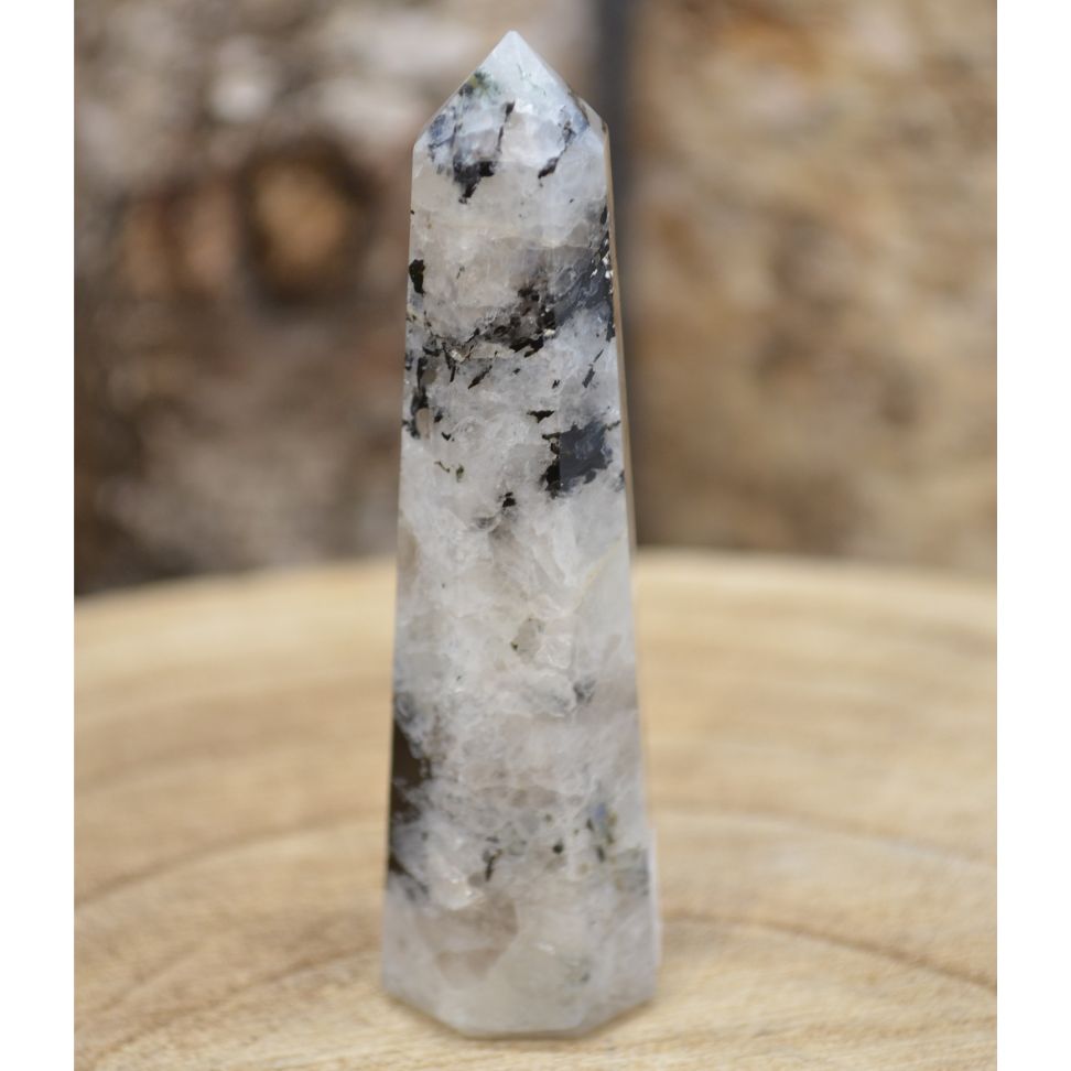 Ein Point/Turm aus weißem Labradorit. Der weiße Labradorit wird oft Regenbogenmondstein genannt. Durch Einschlüsse von Turmalin ergibt sich eine einzigartige Maserung.