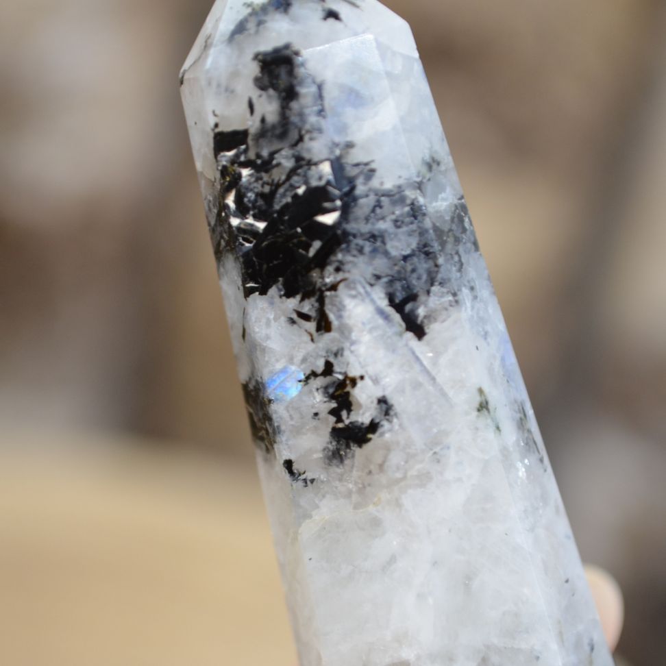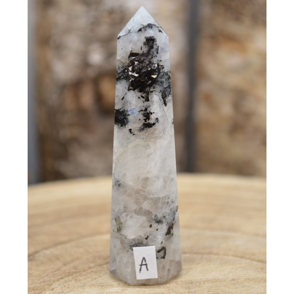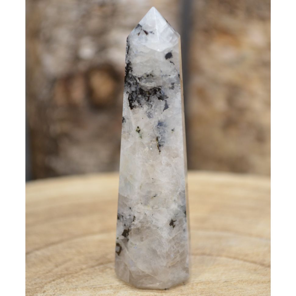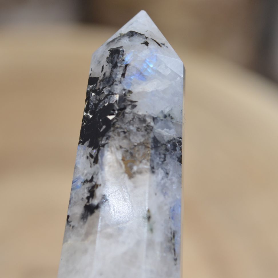 Ein Point/Turm aus weißem Labradorit. Der weiße Labradorit wird oft Regenbogenmondstein genannt. Durch Einschlüsse von Turmalin ergibt sich eine einzigartige Maserung.